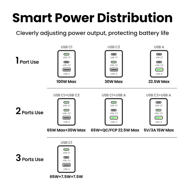 • 3-Port USB C Laptop Charger: Fast charge 3 devices simultaneously with intelligent power distribution (up to 100W).
